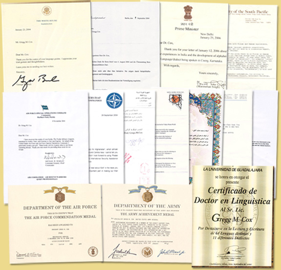 On an official note, Gregg Cox has received awards and recognition for his language contribution from many sectors including: (To name just a few)